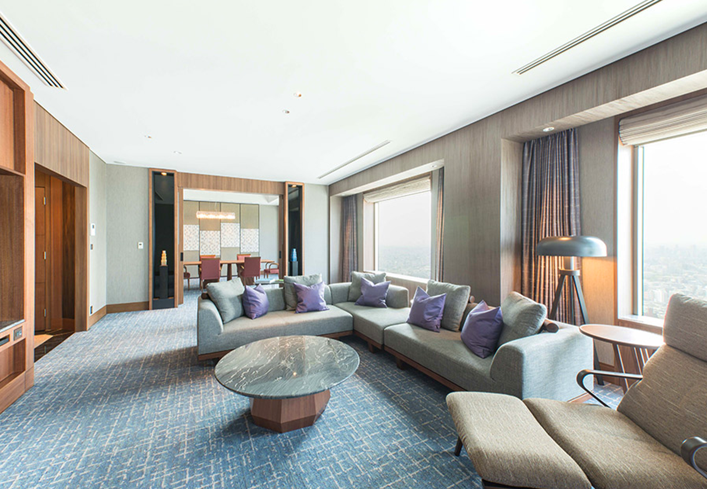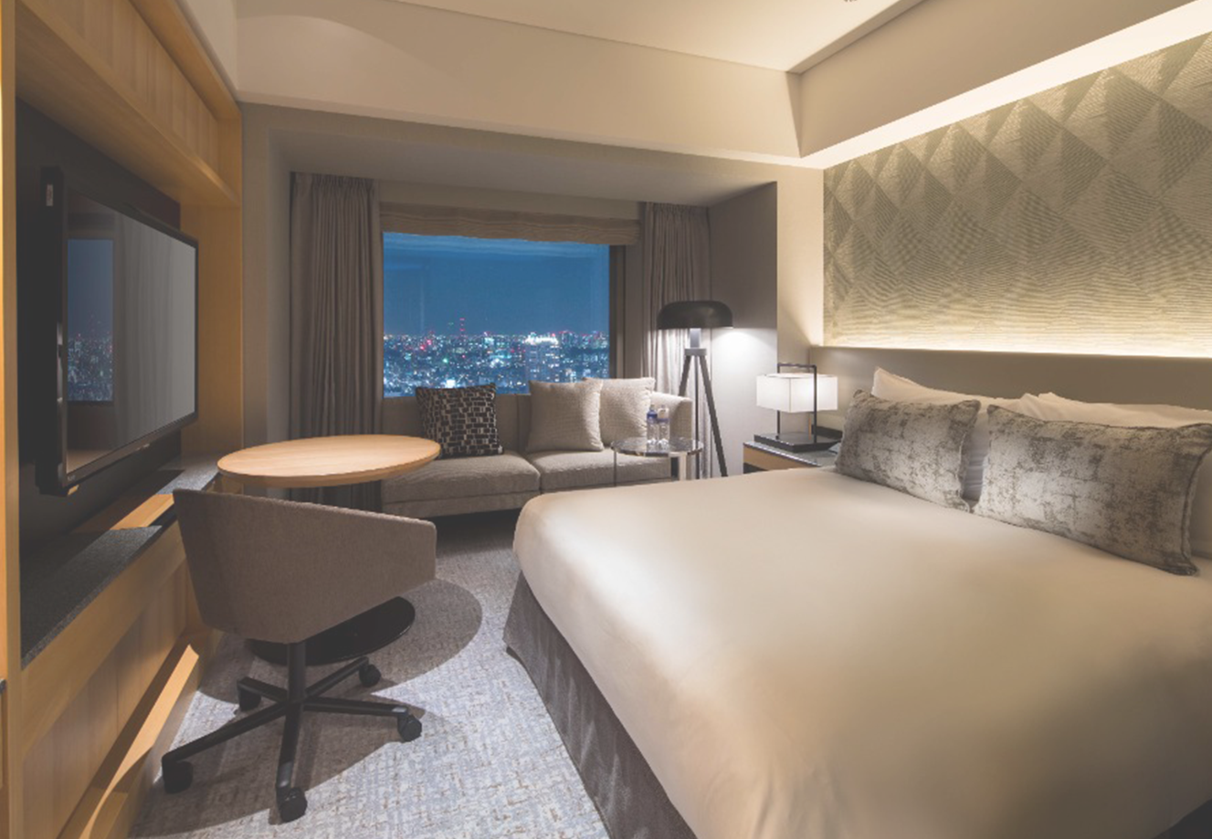 Upon stepping onto the Executive Floor, guests are welcomed by a refreshing fragrance of Hinoki (Japanese cypress) and juniper, instantly transporting them from the bustling streets of Shibuya to a serene, luxurious environment. The Executive Floor features 15 different room types, including the "Deluxe King," which showcases an elegant gray design and spans 42.6 square meters, offering a sophisticated space perfect for adult getaways.